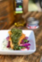 These fish bowls are packed full of flavor! We topped our cilantro lime rice with spicy white fish and on top of that is our home made chimichurri sauce.